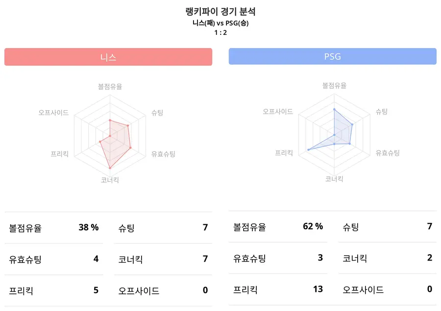 더불어, 랭키파이 데이터 분석에 따르면, 니스의 트렌드 지수가 610에 달하는 반면, PSG는 2,748 포인트를 기록, 양 팀 간 2,138 포인트 차이를 보였다.