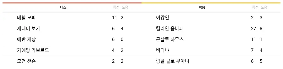 PSG의 이강인은 득점 2, 도움 3을 기록하고 있으며, 킬리안 음바페는 득점 27, 도움 8을 기록하였다.