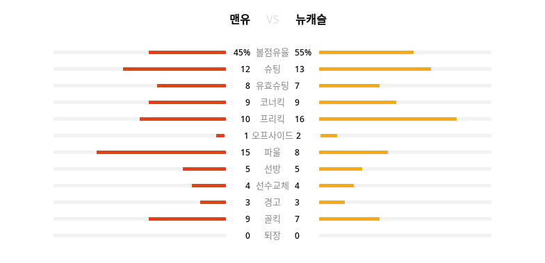 | 뉴캐슬 | 득점 | 도움 | 슈팅 | 유효슈팅 | 패스 | 인터셉트 | 패스차단 | 태클 | 파울 | 걷어내기 | 경고 | 퇴장 |