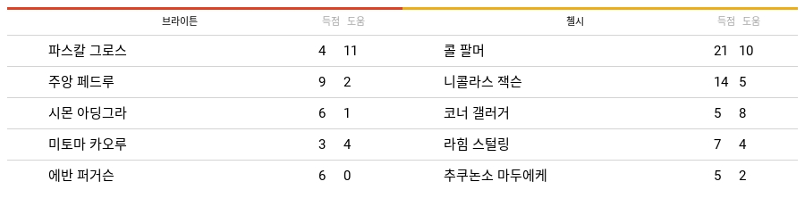 2023-24시즌 동안 브라이튼과 첼시에서 기록된 최다 공격 포인트 선수들의 데이터는 아래 표와 같다.