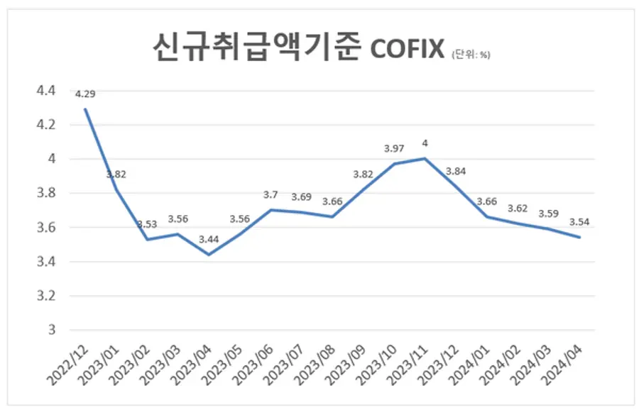 16일 은행연합회에 따르면, 지난 4월 신규취급액 기준 코픽스는 전월 대비 0.05%포인트 내린 3.54%로 집계됐다. 이는 지난해 4월 3.44% 이후 1년 만에 최저치로, 5개월 연속 3%대를 나타냈다.