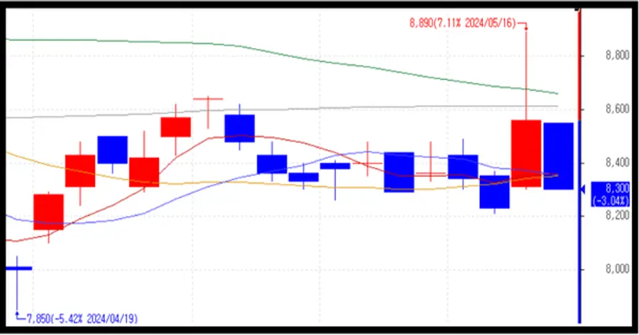 대구은행의 지주회사 DGB금융지주의 주가는 17일 오전 9시 31분 현재 전일 대비 2.80% 하락한 8320원을 기록 중이다. 전일 장중 7% 넘게 뛰었다가 4.01% 상승한 8560원에 마감했다.