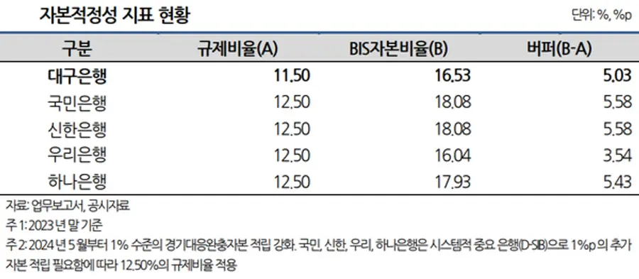 대구은행에 7천억원을 지원해도, "DGB금융지주의 이중레버리지비율은 126.7%로 금융당국의 권고 수준인 130% 이하로 유지된다"며 "은행지주회사로 전환이 DGB금융지주의 재무 안정성에 미치는 영향은 제한적"이라고 분석했다.