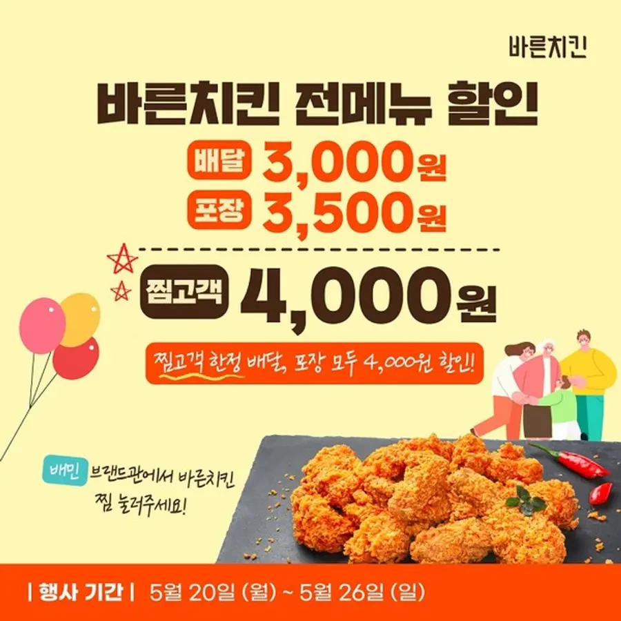‘배달의민족’ 앱에서 ‘바른치킨’을 검색하고 ‘바른치킨’의 주메뉴를 선택해 주문하면 자동으로 할인이 적용되며, ‘배달의 민족’ 앱을 이용하는 고객이라면 누구나 할인 혜택을 받을 수 있다.