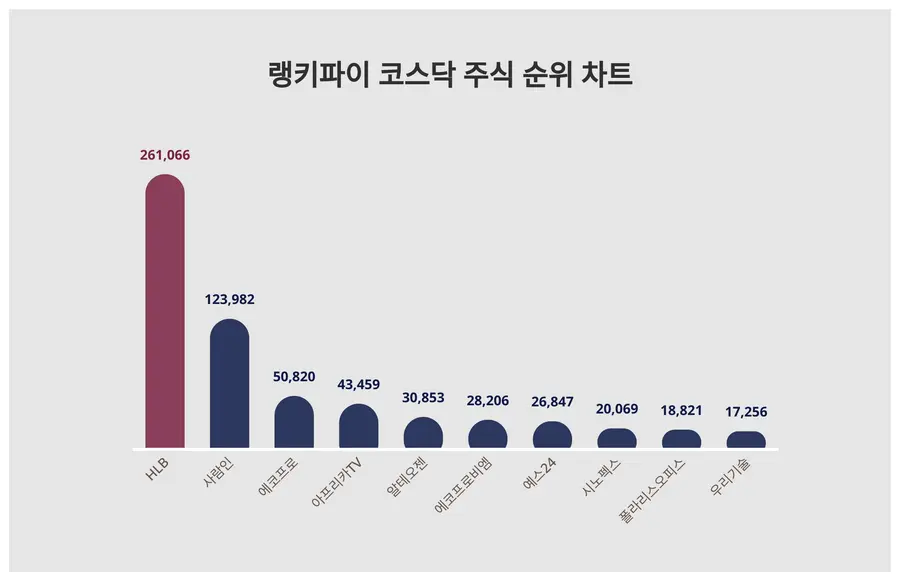 1위 HLB 주가는 트렌드지수 261,066점으로 전주 72,084점보다 188,982점 상승했다.