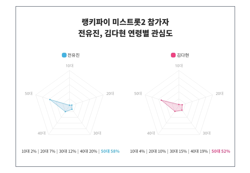 연령별 관심도 조사에서 전유진과 김다현의 관심도가 다양한 연령층 사이에서 어떻게 분포되어 있는지 명확히 드러났다. 조사 결과, 전유진은 특히 50대에서 58%의 높은 관심도를 기록하며 가장 큰 관심을 끌고 있는 것으로 나타났다. 전유진의 인기는 10대 2%, 20대 7%, 30대 12%, 40대 20%, 50대 58%순으로 이어지며, 각 연령대별에서 어떠한 관심을 받고 있는지가 조사되었다.