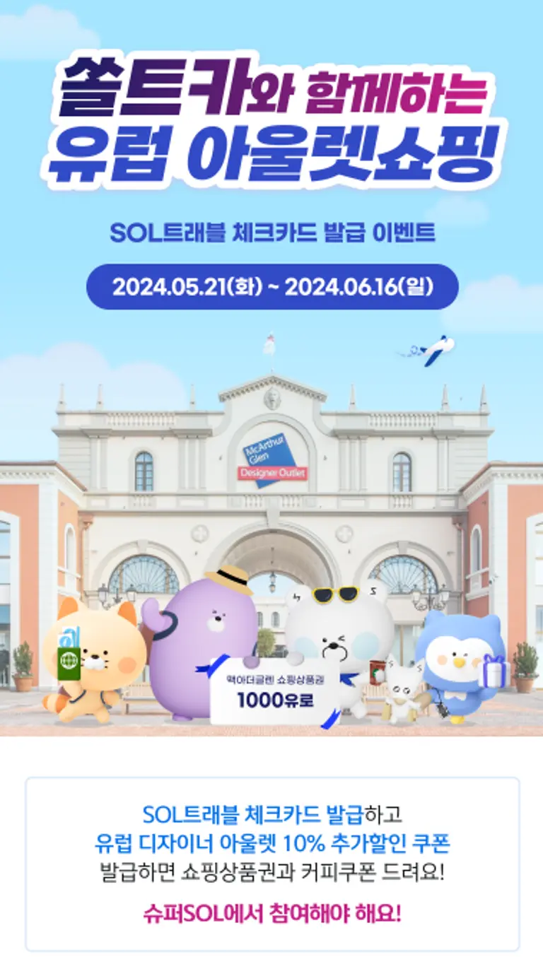 21일부터 다음 달 16일까지 그룹 통합 슈퍼앱 신한 슈퍼SOL 이벤트 페이지에서 SOL트래블 카드를 처음 발급받으면, 전 세계 9개국 맥아더글렌 디자이너 아웃렛 25곳에서 10% 추가할인을 받는 할인 쿠폰을 제공한다.