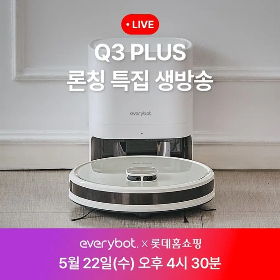 AI 서비스 로봇 전문기업 에브리봇(대표 정우철)은 자사 신제품 로봇청소기 'Q3 PLUS'의 롯데홈쇼핑 론칭 방송을 진행한다고 21일 밝혔다.
