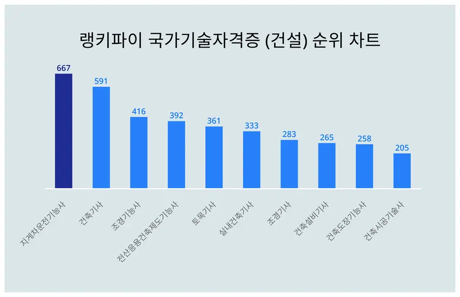 빅데이터로 분석한 결과에 따르면 지게차운전기능사가 1위로 선두를 달리고 있다. 뒤를 이어 2위 건축기사, 3위 조경기능사 순으로 나타났다.