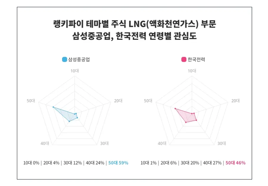 더불어 한국전력은 50대에서 46%로 높은 지지를 얻고 있으며, 10대 1%, 20대 6%, 30대 20%, 40대 27%, 50대 46% 순으로 관심도를 보여주고 있다. 이는 두 트렌드에 대한 연령별 관심도가 어떻게 형성되고 있는지를 보여준다.