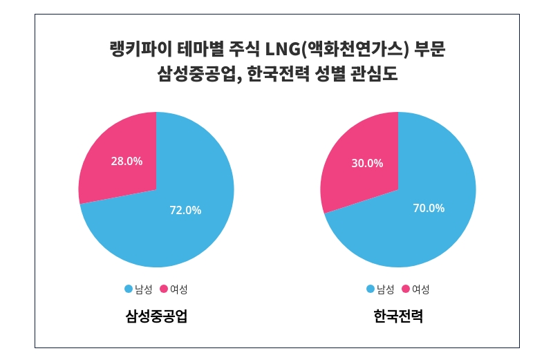 성별 관심도 분석에서 삼성중공업은 '남성'에게 '72%'의 관심을 받고 있으며, 삼성중공업은 여성보다 '남성'에게 높은 관심을 받고 있는 것으로 나타났다.이어 한국전력은 '남성'에서 '70%'의 높은 관심도가 나타났으며, 여성보다 '남성'에게 더 많은 관심을 받고 있음이 드러났다.