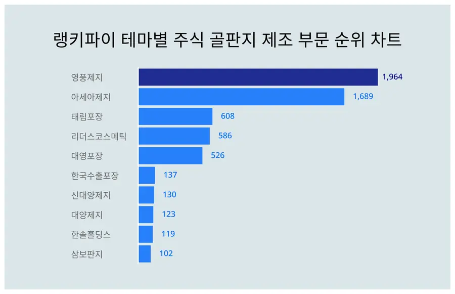 테마별 주식 골판지 제조 부문 트렌드지수 순위 1위는 1,964포인트를 받은 영풍제지, 2위는 1,689포인트인 아세아제지, 3위는 608포인트의 태림포장이다.