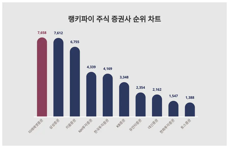 차트를 살펴보면 미래에셋증권이 7,658포인트로 해당 부문 1등을 기록했다. 바로 뒤 삼성증권이 7,612포인트로 2등을 차지했다.