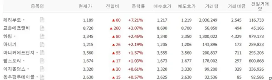 22일 아프리카 돼지 열병 소식에 닭고기(육계) 관련주들이 일제히 오름세다. 삼계탕 등 복날 예비 수요 기대감도 가세했다는 지적도 나오고 있다. 22일 오전 10시45분 현재 체리부로가 전날보다 7.21%(80원) 오른 1189원에 거래되고 있고, 교촌에프엔비(3.07%), 하림(2.45%), 마니커(2.19%) 등 육계 관련주들이 상승세다.