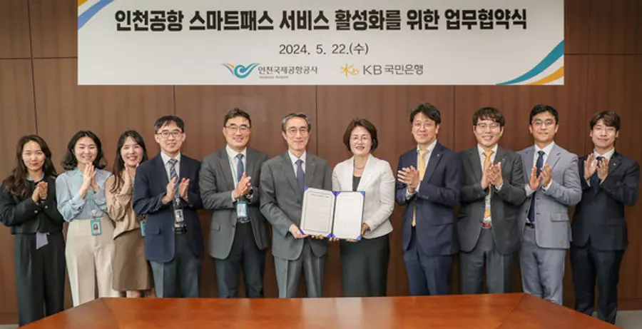 KB국민은행이 22일 인천 중구 공항청사에서 인천국제공항공사와 스마트패스 서비스 업무협약을 체결했다. 유구종 인천국제공항공사 운영본부장, 곽산업 KB국민은행 디지털사업그룹 부행장 등 관계자들이 협약식에 참석했다.
