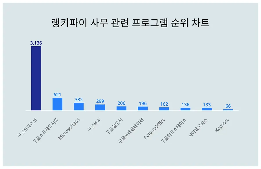 빅데이터로 분석한 결과에 따르면 구글드라이브가 1위로 선두를 달리고 있다. 뒤를 이어 2위 구글스프레드시트, 3위 Microsoft365 순으로 나타났다.