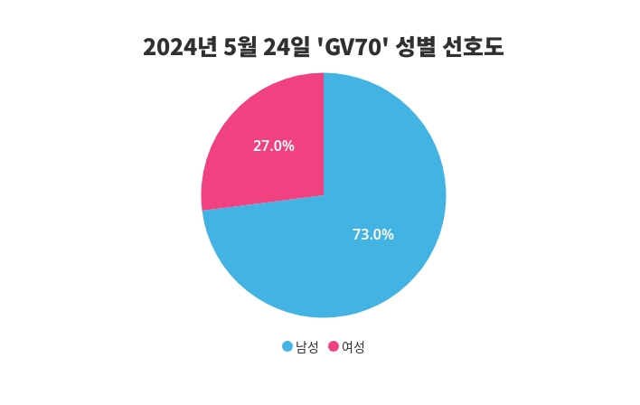 GV70의 최신 성별 관심도 조사 결과, 전일 남성 74%, 여성 26%의 결과가 나왔고, 금일에는 남성이 73%의 비율로 GV70에 더 높은 관심을 갖는 것으로 나타났다.
