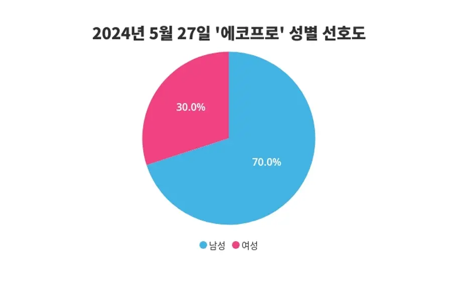에코프로의 성별 관심도에서 남성가 70% 비율로 에코프로에 대한 관심도가 상대적으로 높은 것으로 나타났다.