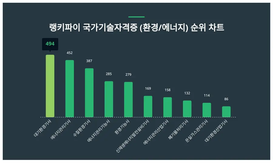 분석 결과 국가기술자격증 (환경/에너지) 트렌드지수 순위 1위는 494포인트를 받은 대기환경기사, 2위는 452포인트인 에너지관리기사, 3위는 387포인트의 수질환경기사이다.