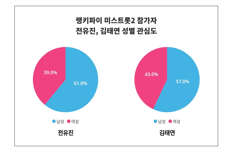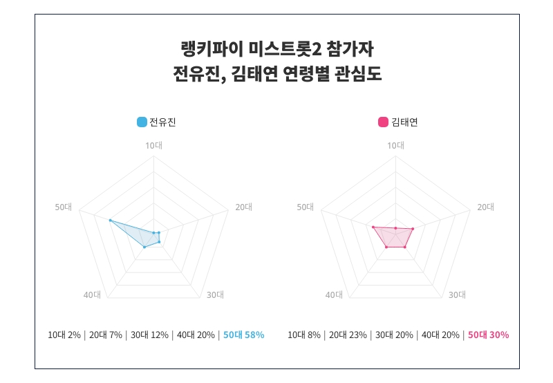 연령별 관심도 조사에서 전유진과 김태연의 관심도가 다양한 연령층 사이에서 어떻게 분포되어 있는지 명확히 드러났다. 조사 결과, 전유진은 특히 50대에서 58%의 높은 관심도를 기록하며 가장 큰 관심을 끌고 있는 것으로 나타났다. 전유진의 인기는 10대 2%, 20대 7%, 30대 12%, 40대 20%, 50대 58%순으로 이어지며, 각 연령대별에서 어떠한 관심을 받고 있는지가 조사되었다.