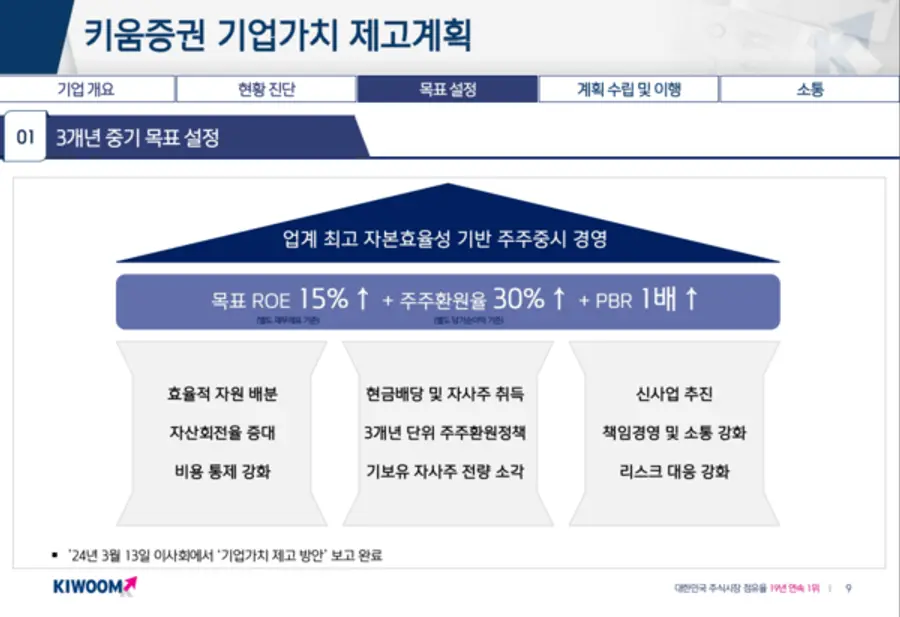 포럼은 "14장 짜리 “키움증권 기업가치 제고계획”은 국문 자료와 영문 자료가 동시에 제공되어 27% 지분을 보유하고 있는 외국인 투자자와 잠재 외국인 주주를 배려한 것으로 보인다"며 "3개년 중기 목표로 ROE 15% 이상, 주주환원율 30% 이상, PBR 1배 이상을 제시했다. 이는 2023년 기준 각각 ROE 8%, 주주환원율 47%, PBR 0.5배과 비교해 의미있는 목표 설정"이라고 평가했다.
