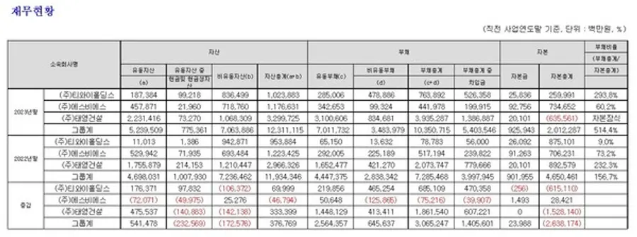 29일 태영그룹의 지주사 티와이홀딩스가 금융감독원 전자공시시스템에 공시한 대규모기업집단현황공시에 따르면 작년말 기준 태영그룹의 자산총액은 12조 3111억원(+3768억원). 부채총액은 10조3507억원(+3조652억원)이다. 자본총계는 2조123억원으로 전년 대비 2조6382억원 감소했다. 1년새 자기자본의 절반 가량이 사라졌다. 이로써 부채총계가 자기자본의 5배 이상되는 기형적 재무구조를 띄고 있다. 부채비율은 514.4%로 2022년말 156.7%에서 1년새 비율이 357.7%p 급등했다.