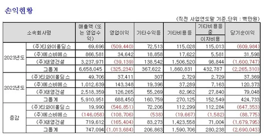 태영그룹의 지난해 총매출은 6조6580억원을 기록했지만 그룹 당기손손실이 2조2653억원을 기록했다. 2022년 그룹 총매출액은 5조9109억원이었다. 매출이 1년새 7471억원 늘었지만 손실증가폭이 상대적으로 두드러졌다. 주력사인 SBS의 실적 부진도 두드러졌다. SBS의 지난해 총매출은 8666억원으로 2022년도 1조127억원 대비 14.4%(1460억) 줄었다. 지난해 영업이익(346억원)과 순익(316억원)은 전년비 각각 75%(1087억원)와 74%(888억원)씩 감소했다. SBS는 2022년 그룹손익의 28.3%를 차지했다.