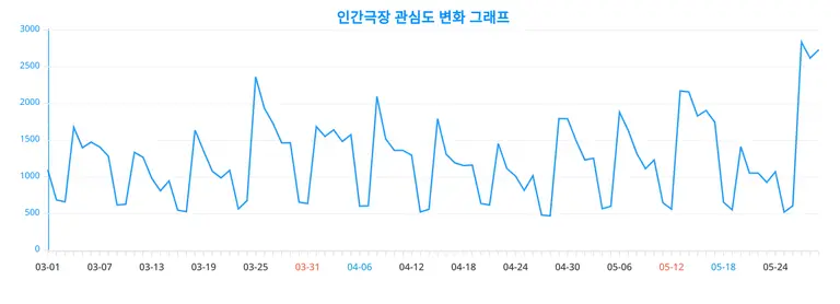 이번에 공개된 인간극장 관련 90일간 트렌드 변화 그래프는 트렌드 변동을 데이터로 흥미롭게 보여주고 있다.