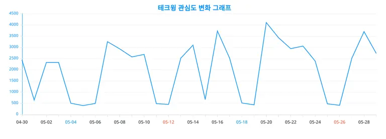 테크윙에 대한 트렌드지수 그래프에서 현재 2,733포인트로, 전일 3,706포인트보다 하락하며 변화를 보였다.