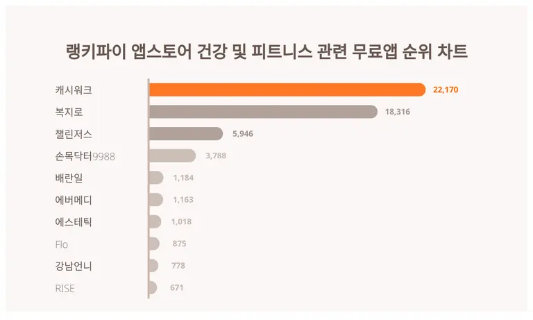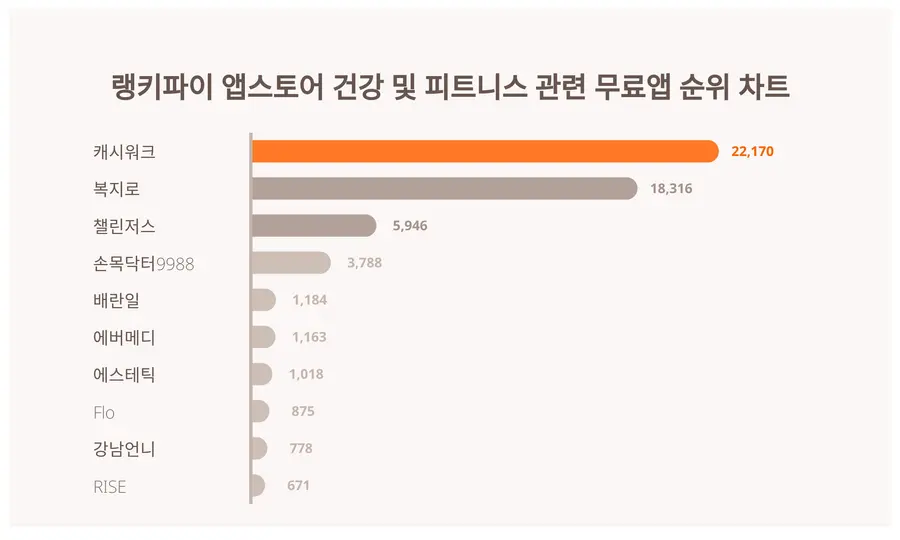 AI기반 빅데이터 프로그램을 갖춘 랭키파이는 각 분야별 트렌드지수를 도출한다. 이날 랭키파이 분석에 따르면 캐시워크가 5월 4주차 기준 앱스토어 건강 및 피트니스 관련 무료앱 부문 트렌드지수 1위로 집계됐다.