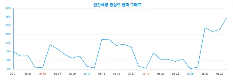 인간극장에 관한 트렌드지수는 현재 3,503 포인트를 기록, 전일 2,783 포인트 대비 상승하였다.
