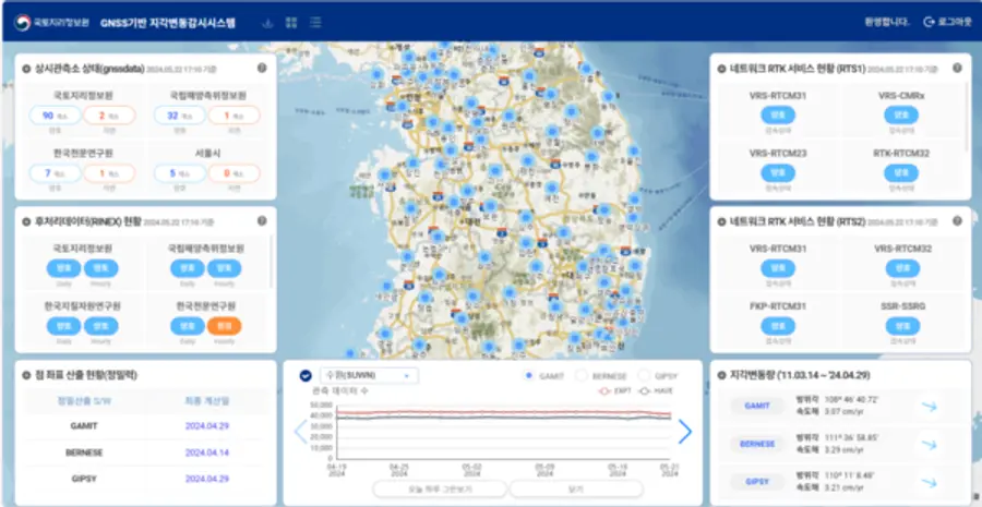 국토교통부 국토지리정보원(원장 조우석)은 GNSS 지각변동 감시시스템에서 국토의 일단위 변화량을 공개한다고 3일 밝혔다.