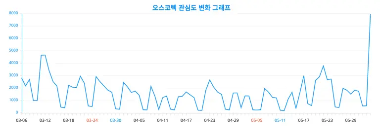 아래 일간 트렌드 그래프는 오스코텍에 대한 일간 트렌드 변화 추이가 90일간 어떻게 변화했는지를 드러내고 있다.