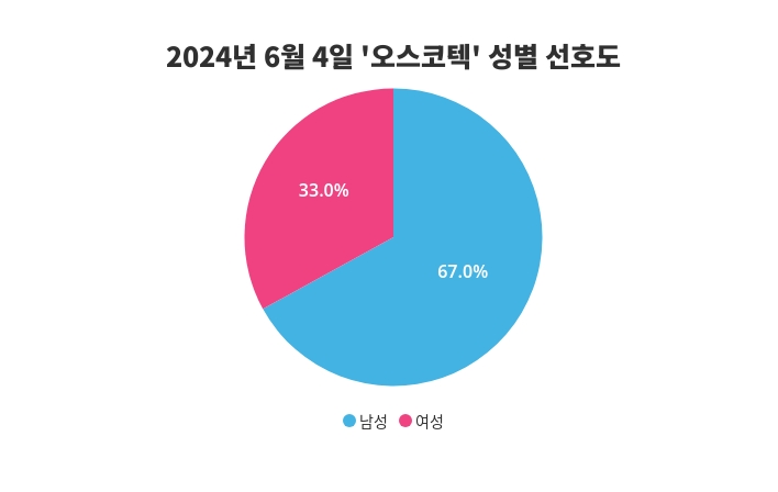 금일 오스코텍에 대한 성별 관심 조사에서는 남성이 67%의 비율로 더 큰 관심을 보이며 성별 간의 차이를 드러냈다.