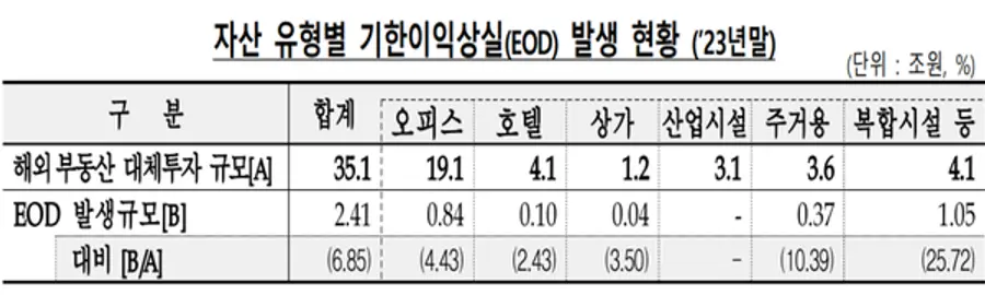 작년 말 금융회사가 투자한 부동산(단일 사업장) 35조1천억원 중 6.85%에 해당하는 2조4100억원에서 기한이익상실(EOD) 사유가 발생했다.