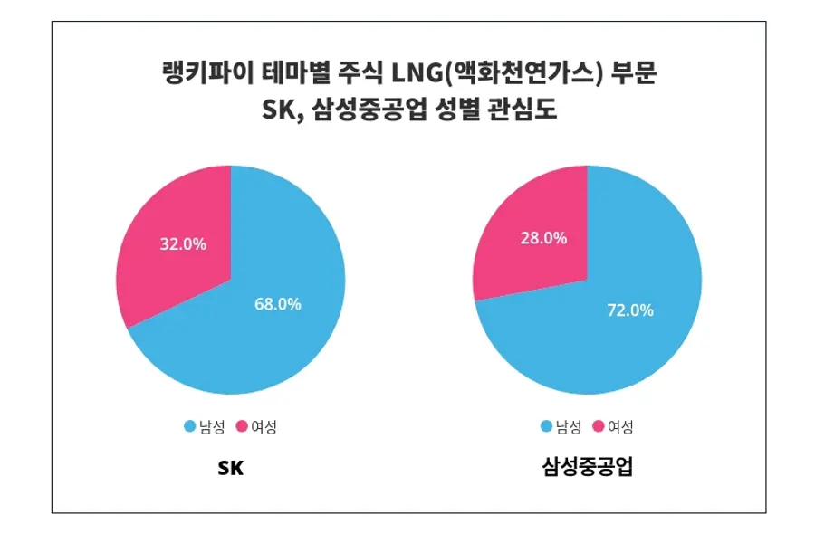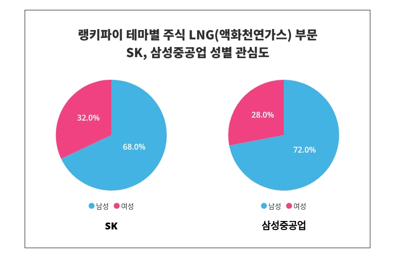 성별 관심도 분석에서 SK는 '남성'에게 '68%'의 관심을 받고 있으며, SK는 여성보다 '남성'에게 높은 관심을 받고 있는 것으로 나타났다.이어 삼성중공업은 '남성'에서 '72%'의 높은 관심도가 나타났으며, 여성보다 '남성'에게 더 많은 관심을 받고 있음이 드러났다.