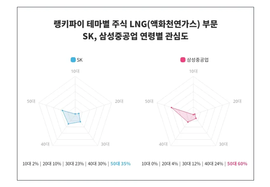 더불어 삼성중공업은 50대에서 60%로 높은 지지를 얻고 있으며, 10대 0%, 20대 4%, 30대 12%, 40대 24%, 50대 60% 순으로 관심도를 보여주고 있다. 이는 두 트렌드에 대한 연령별 관심도가 어떻게 형성되고 있는지를 보여준다.