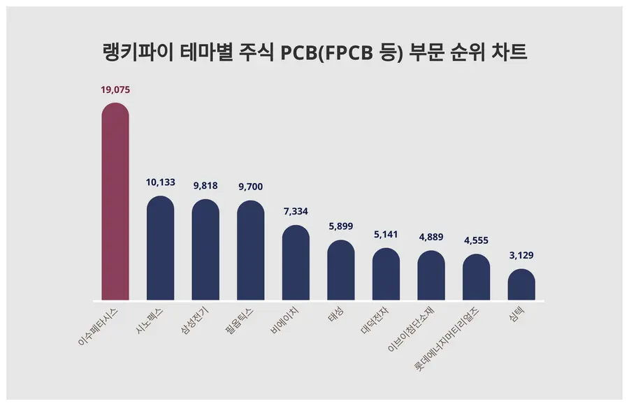 ▲테마별 주식 PCB(FPCB 등) 부문 트렌드 지수 분석 결과 ⓒ랭키파이