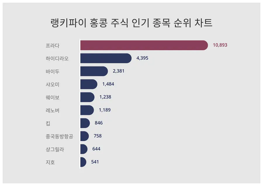 랭키파이 분석 결과 홍콩 주식 인기 종목 트렌드지수 순위 1위는 10,893포인트를 받은 프라다, 2위는 4,395포인트인 하이디라오, 3위는 2,381포인트의 바이두(이)다.