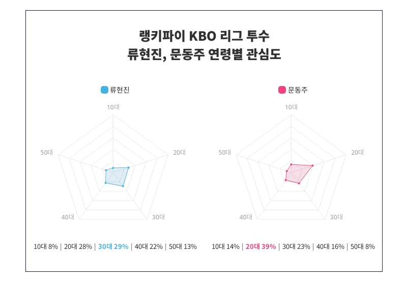 연령별 관심도 조사에서 류현진과 문동주의 관심도가 다양한 연령층 사이에서 어떻게 분포되어 있는지 명확히 드러났다. 조사 결과, 류현진은 특히 30대에서 29%의 높은 관심도를 기록하며 가장 큰 관심을 끌고 있는 것으로 나타났다. 류현진의 인기는 10대 8%, 20대 28%, 30대 29%, 40대 22%, 50대 13%순으로 이어지며, 각 연령대별에서 어떠한 관심을 받고 있는지가 조사되었다.