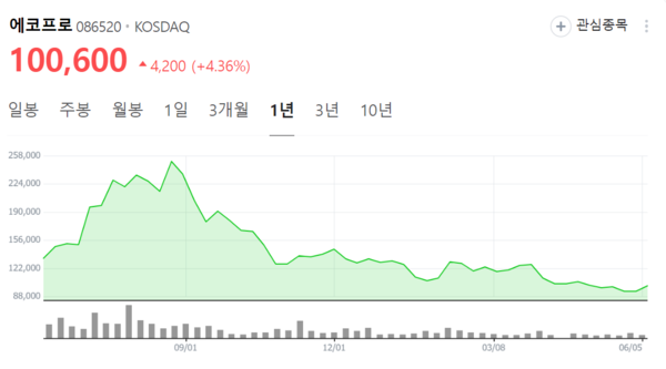 에코프로는 지난달 31일 8만8400원까지 내려가면서 연중 최저는 물론이고, 지난해 7월24일 최고가 30만7800원 대비 손실률이 71.3%에 달했다. 그러다 다시금 10만원대로 회복했다.