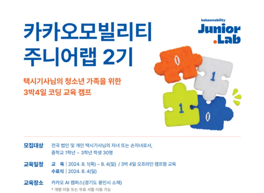 ‘카카오모빌리티 주니어랩 2기’는 전국 개인・법인・가맹 택시 기사님의 중학생 자녀 및 손자녀라면 누구나 지원 가능하다.