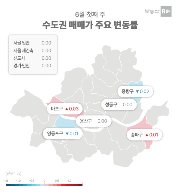 서울은 자치구별로 △마포(0.03%) △송파(0.01%)가 상승했고, △중랑(-0.02%) △영등포(-0.01%)가 하락했다. 나머지 지역은 보합(0.00%)을 나타냈다. 신도시는 모든 개별지역이 보합을 기록했고 경기·인천은 인천이 0.02% 오른 반면, 의정부는 0.01% 떨어졌다. 그 외 지역들은 가격 변동이 없었다.