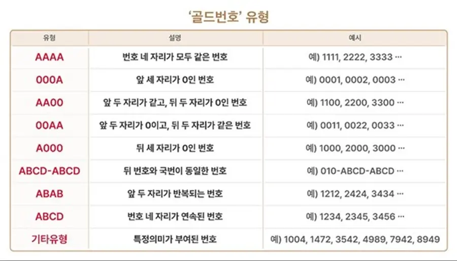 골드번호는 1111, 0002, 3000처럼 특정 패턴이 있거나 국번과 동일한 번호(ABCD-ABCD, ABAB-ABAB 등) 또는 특정한 의미(1004, 1472)를 갖는 번호다. 이번에 응모할 수 있는 골드번호는 9가지 유형으로, 1인당 최대 3개까지 응모할 수 있다.
