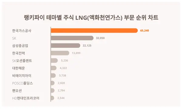 테마별 주식 LNG(액화천연가스) 부문 트렌드지수에서 한국가스공사 주가는 랭키파이 2024년 6월 2주차 트렌드지수 분석 결과 1위를 차지했다.