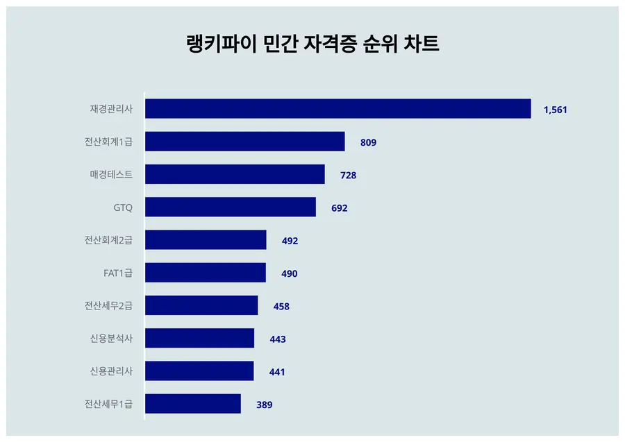 한편, 11위는 데이터분석준전문가, 12위 리눅스마스터, 13위 외환전문역1종, 14위 회계관리1급, 15위 TAT2급, 16위 자산관리사, 17위 원산지관리사, 18위 회계관리2급, 19위 외환전문역2종, 20위는 네트워크관리사 순이다.