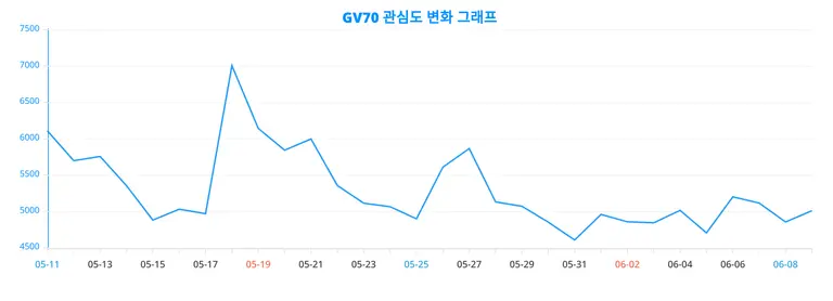 GV70에 관한 트렌드지수는 현재 5,014 포인트를 기록, 전일 4,859 포인트 대비 상승하였다.