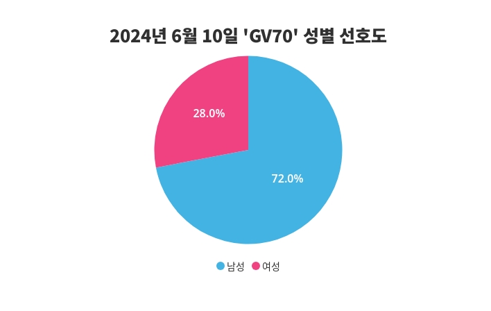 GV70의 최신 성별 관심도 조사 결과, 전일 남성 73%, 여성 27%의 결과가 나왔고, 금일에는 남성에게 72%의 비율로 더 높은 관심을 받는 것으로 나타났다.