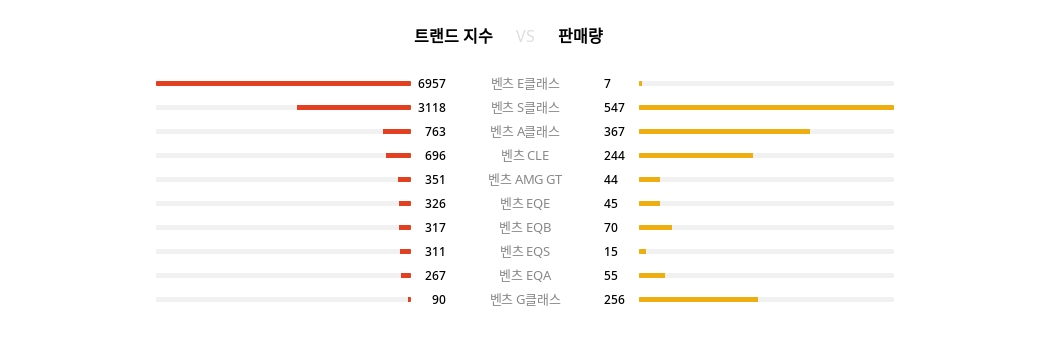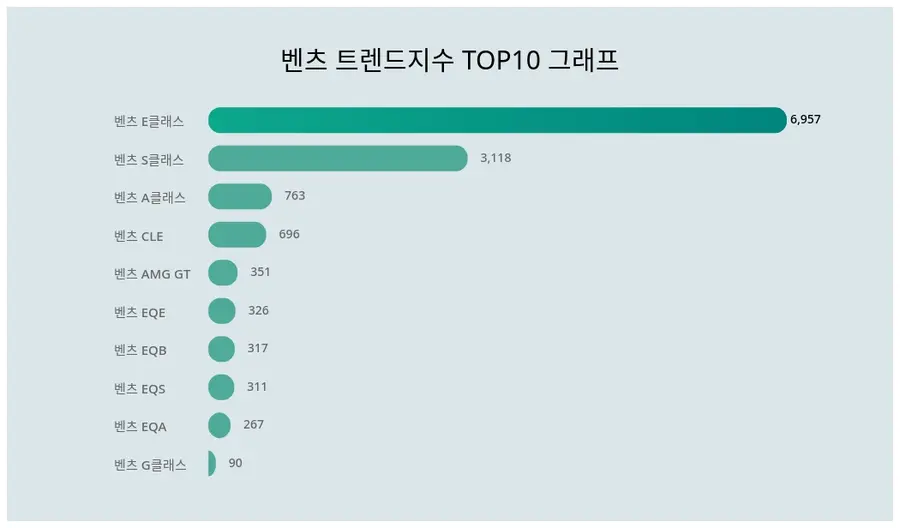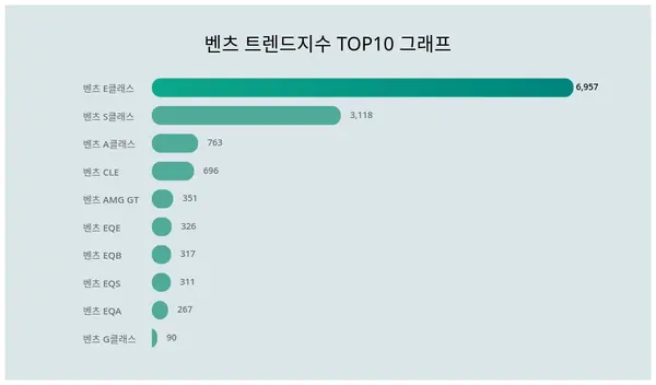 트렌드지수 1위는 벤츠 E클래스가 6,957포인트를 기록하며 가장 많은 관심을 갖는 것으로 나타났으며, 2위 벤츠 S클래스, 3위 벤츠 A클래스, 4위 벤츠 CLE, 5위 벤츠 AMG GT 순으로 나타났다,