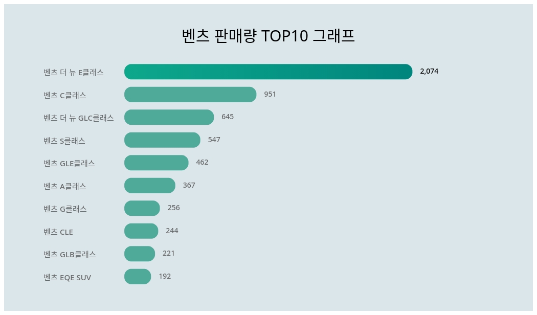 더불어 판매량 1위는 벤츠 더 뉴 E클래스가 2,074대의 판매량을 기록했다. 또한 2위 벤츠 C클래스, 3위 벤츠 더 뉴 GLC클래스, 4위 벤츠 S클래스, 5위 벤츠 GLE클래스 순으로 나타났다.